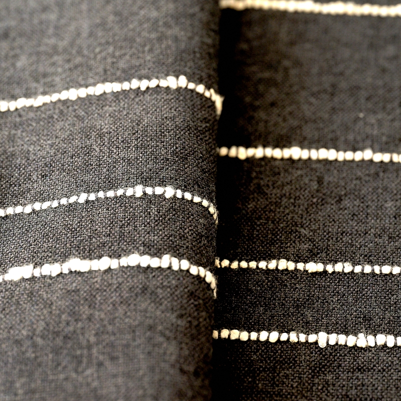 Ce tissage mêle 2 matières nobles et naturelles, le lin et la laine et prend le parti d’une fine rayure horizontale de laine bouclée pour animer et rythmer irrégulièrement la surface de sa toile de lin. Son raccord volontairement important fait que l’œil ne repère pas immédiatement la répétition et glisse en légèreté sans être arrêté par le rythme. C’est pour cette raison (en plus de ses matériaux aux teintes naturelles ) que Suffolk installe une atmosphère sereine et apaisante.