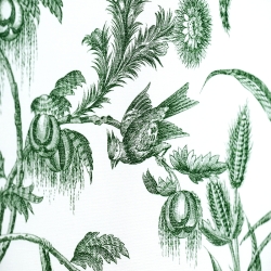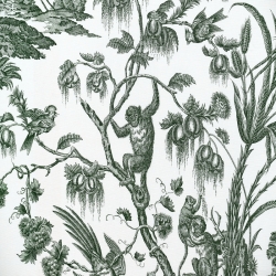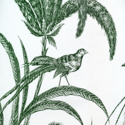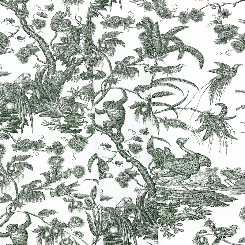 Toile de Jouy au dessin animalier et tropicale par sa forêt dense. Le dessin de cette toile de Jouy est d’une incroyable finesse, ce qui en fait un tissu élégant et raffiné. Cette toile de Jouy est une toile en métis (Coton et Lin).