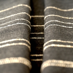 Sans renier une allure intemporelle, ce tissage revendique la personnalité audacieuse d’une main authentique et vraie. Il évoque le tissage artisanal par l’irrégularité assumée de sa bouclette et l’audace de son graphisme horizontal. Collection Poétique Alchimie.