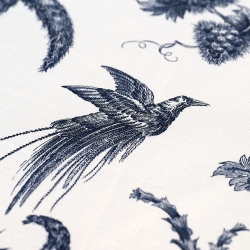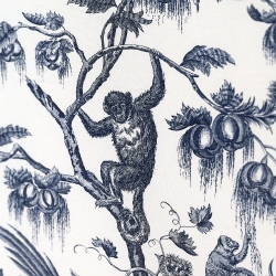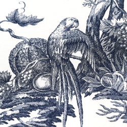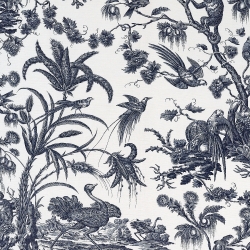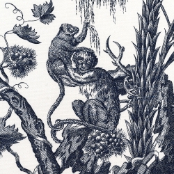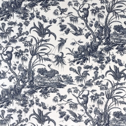 Toile de Jouy au dessin animalier et tropicale par sa forêt dense. Le dessin de cette toile de Jouy est d’une incroyable finesse, ce qui en fait un tissu élégant et raffiné. Cette toile de Jouy est une toile en métis (Coton et Lin).